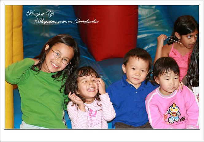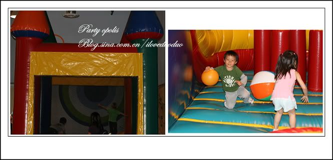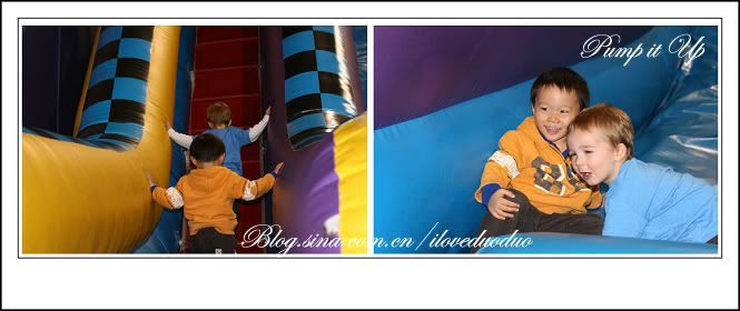 不过,随着各种各样提供生日派对的公司的兴起,很多人都喜欢上了这种省时省力的外包形式。象多多这个年龄, 最受欢迎的是那种有充气床蹦跳的地方,多多去的那两个party都是在这样的地方办的,一个地方叫做Pump it Up, 另一个地方叫PARTYOPOLIS - Bounce& Play Central., 两个地方大同小异,都是充气的大型滑梯,蹦床等等,有点象国内的翻斗乐。蹦完后孩子们聚在一起吃饭(一般是比萨饼),切蛋糕唱生日歌。