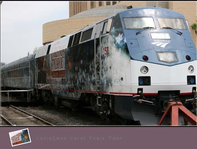 圣诞颂歌其实是迪斯尼公司09年11月将要推出的一部电影“A Christmas Carol".这列火车是为影片做的推广活动,火车里象是一个小小的博物馆,展览着电影里的服装道具,视觉效果的合成,音响合成等等。这列火车是从e-bay买的(居然e-bay上也能买火车),然后被涂上了影片里的场景。洛杉矶的Union Station是这列火车环美行的第一站,它将经过全美国的各大城市供人们参观,最后在十月底会到达此行的最后一站纽约。