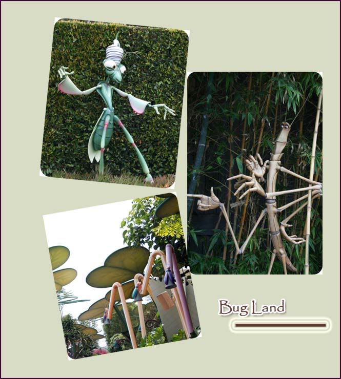 公园内部由四个大型的景区Hollywood Picture Backlot(好莱坞影城), a bug's land(虫虫世界), paradise pier(天堂码头), and golden state (金色之州),反映加州不同的风貌、历史及文化背景。 其中最刺激的项目有恐怖魔塔 (The Twilight Zone Tower of Terror),在5秒之内时速从零到高达55英哩的云霄飞车(California Screamin'),金州梦想之旅(Soarin' Over California),更有太空发射机在2秒内直上180英尺高空(Maliboomer). 恐怖魔塔99年我在佛罗里达的米高梅影城坐过,完全的自由落体,感觉心脏差点跳出来,有那一次的经历足以了。最适合小孩子玩的地方是好莱坞影城和虫虫世界,影城那里有很多迪斯尼的演出并且常有卡通人物出没,特别是迪斯尼频道的Micky Mouse Club House在那里有LIVE Show。虫虫世界的娱乐项目专为小朋友设计,里面用的语言都是虫子国的语言,在那里工作人员自称为worker bees,游人们不管大小都被统称bugs.
