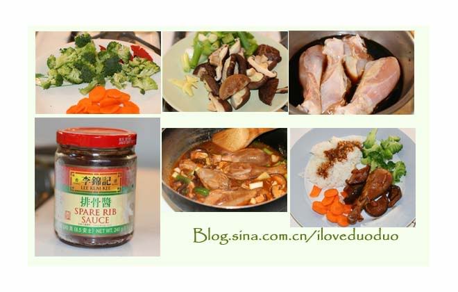 周六上午送儿子学画画,趁机到中国店大采购。回家后,又去了一趟美国店,给儿子采办橙汁,酸奶,营养小零食等等。中午饭从简,直接上买回来的Chicken Nugget,微波炉一加热就解决了,沾上蕃茄酱既方便又深受小多的青睐。中饭吃完,我宣布晚上吃酱香鸡腿烩饭(幸福妈咪版的简易版)。午饭后我就把鸡腿洗净腌好放入冰箱内。下午五点,开始在厨房奋战。战果看上去闻起来还不错,问多爸味道如何,答曰,这排骨酱(李锦记)的味道挺不错的。原来是酱的味道好,不是我手艺佳。此为挫折二。