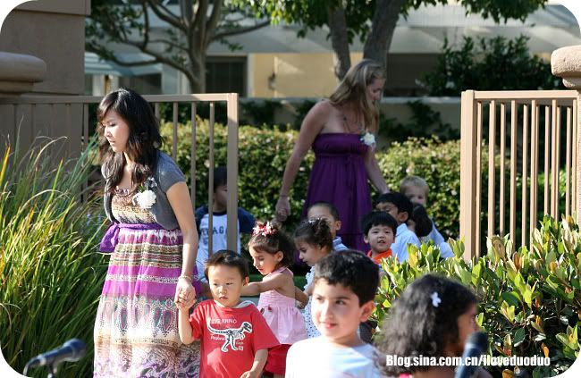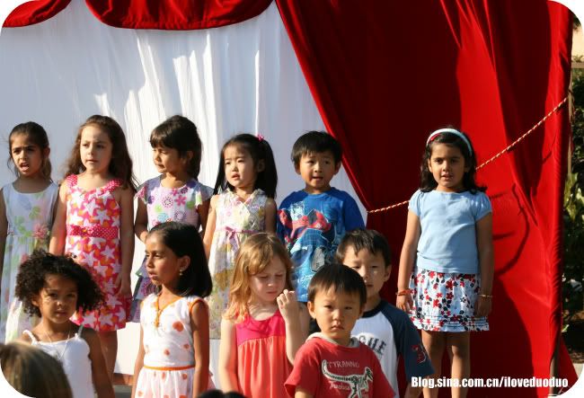 大部分孩子都还不了解舞台的意义,干什么的都有,看着特有趣。舞台太低了,坐在后面很难看清楚,我随便排了两张充数。看到多多严肃得要哭出来的表情了吗?事后他说因为没看到我们,平常眼神那么好,当时我跟他招手人家愣没看见。后来我家小多干脆罢唱跑到校长怀里去了。