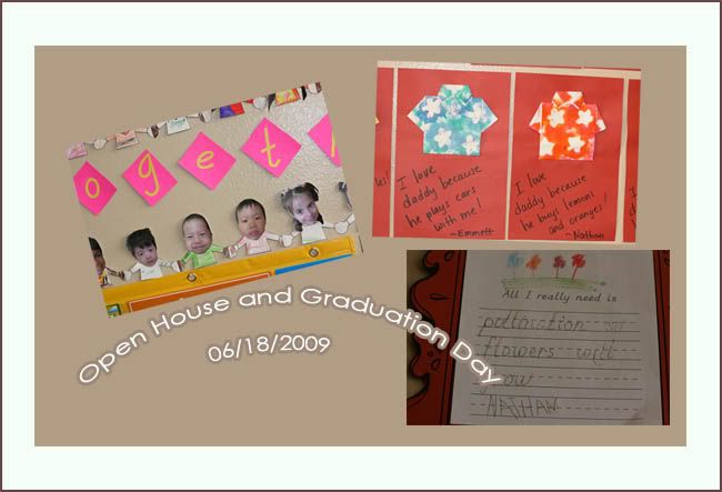 毕业典礼是在他们幼儿园的停车场上举行的,当天临时搭了个小舞台,摆上了一排排的椅子。要毕业小朋友的家长被安排在第一排和第二排。那天也是学校的开放日,家长可以和孩子们一起参观教室,欣赏墙上孩子们的作品。
