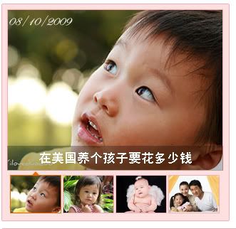 前几天在yahoo上看到一篇关于养孩子花费的文章。据新出炉的政府报告显示,一个中等收入家庭如果有一个于2008出生的孩子,那么把这个孩子养大到17岁需要花费22万美金。如果在考虑到通货膨胀的指数在内的话,22万就变成了29万美金。住房是其中最大的开销(约占30%),其次是吃和于孩子教育有关的投入。
