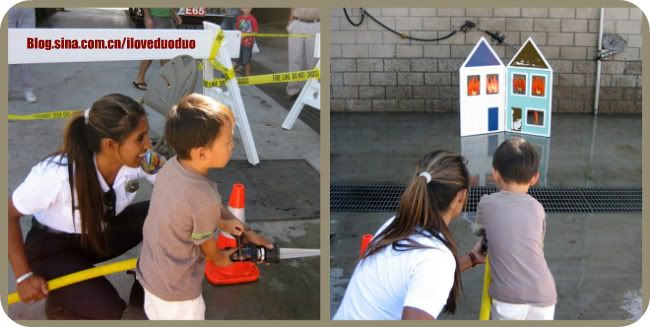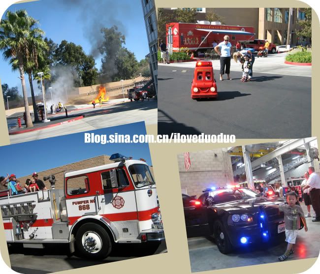 下面的图分别是模拟灭火演习,一辆会喷水的迷你消防车,消防车之旅和警车(图片来源:不是多爸,多姥,就是多多)