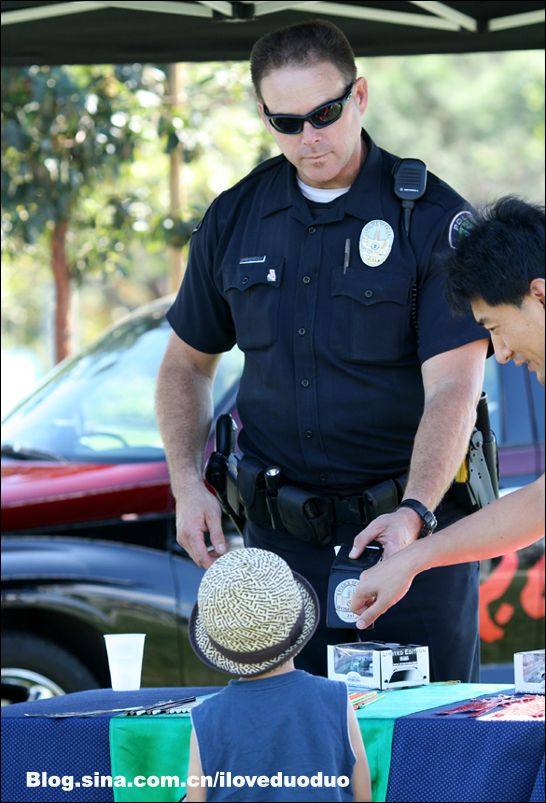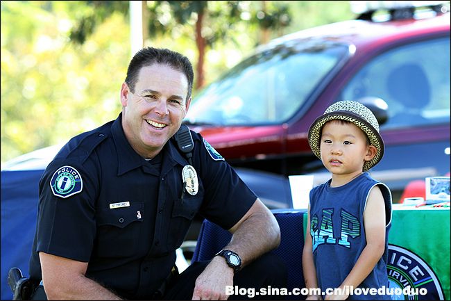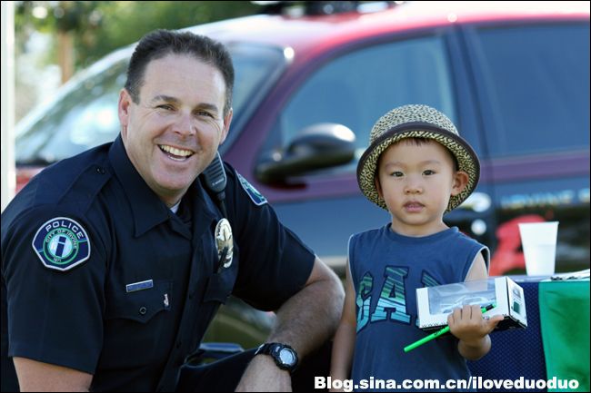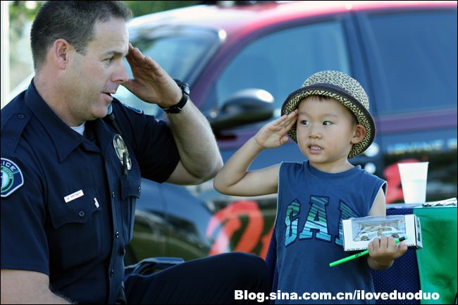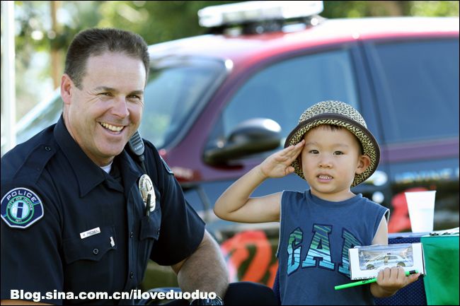 上上个周末,我们家附近的公园建成举办open house。那时候小多正好身体欠佳,就没打算带他去。多姥姥转了一圈回来后说有警察的摊位,于是全家为了小多的警察情结集体出动。小多见了那位人高马大的警察先生,二话没说就敬了个礼,警察先生觉得小多很有意思(估计这位警察先生从没遇到过给他敬礼的小孩),马上回了一个礼。警察先生看见我手中的相机,主动要求和小多合影,还配合着拍出各种造型,然后递给我一张名片,让我把照片发给他一些。当警察先生得知小多的理想是当一名警察的时候,就给了他一件特别珍贵的礼物,一量限量版的小警车,这警车除了尺寸之外跟他们开的警车一模一样,做的很精致很逼真。警察先生对小多说This gift is for special people like you !