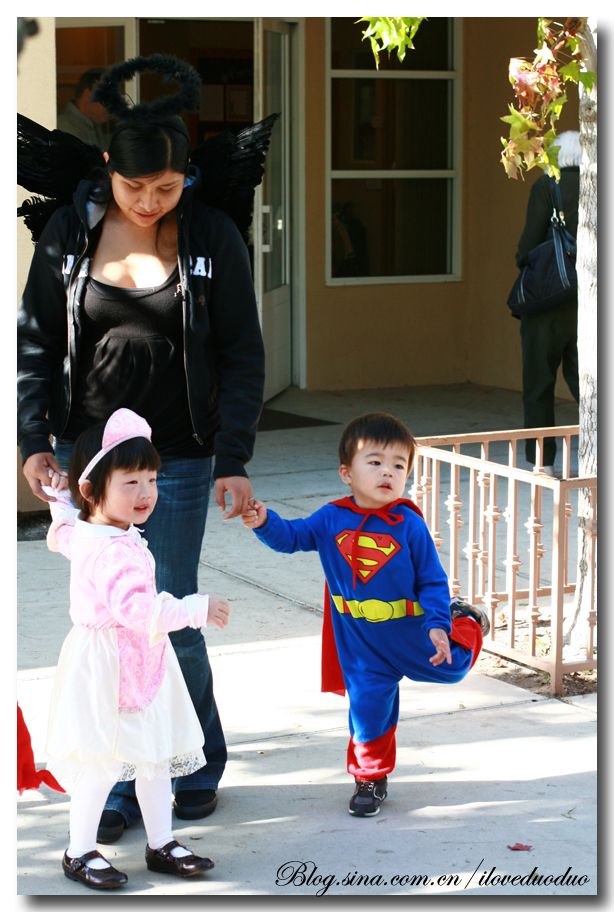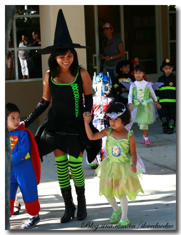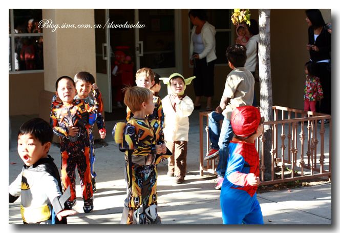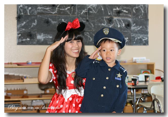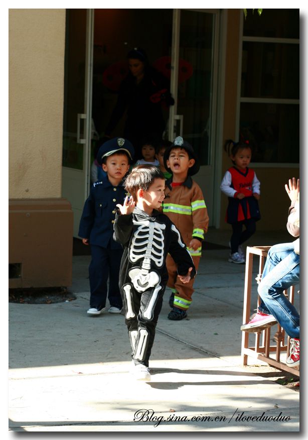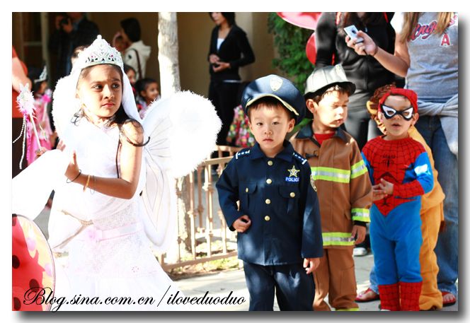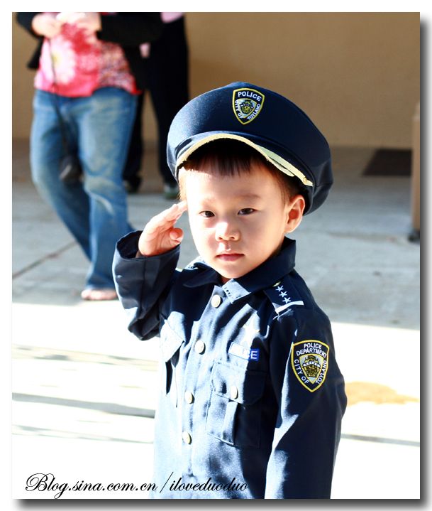 多多幼儿园每年都有万圣节的游行活动,从校长老师到所有的孩子们都是盛装登场.女孩子的打扮多是公主,仙女,美人鱼.男孩子最多的扮像是变形金刚,超人,蜘蛛侠,消防员.多多班上有四个都是变形金刚,而多多的这身警察装扮则是全校独一份.