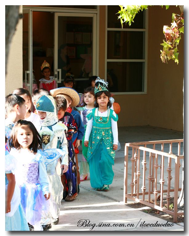 一开始先是每个班里照常有circle time, 每个孩子都要告诉大家自己是什么,然后围着circle走一圈,最后让老师给照张相.当然在这期间,家长们也都忙着用相机记录下一个个可爱的瞬间. 接下来家长们到院子里观看游行.从最大的Kindergarden班开始,然后是多多他们的三个preschool班,最后是最小的toddler班,围着幼儿园走两圈. 看着孩子们从我身边走过,去年游行的情景还历历在目.今年多多长了一岁,相比之下从容了很多,大孩子的样子了.
