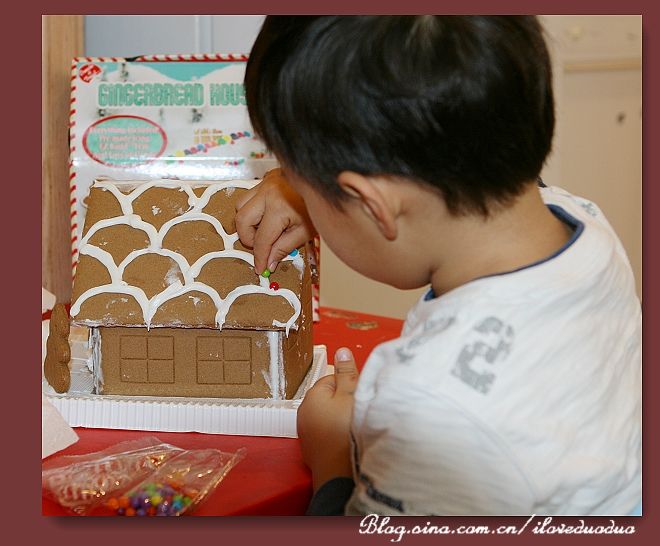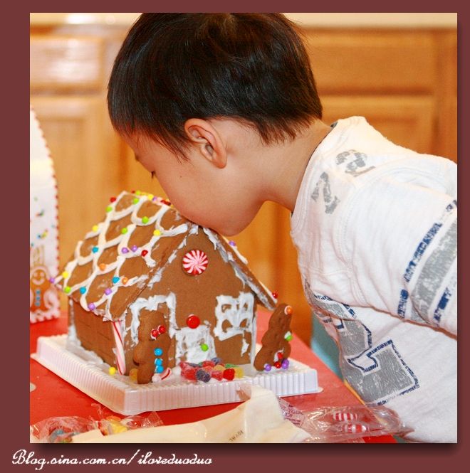 房子架构搭起来后就轮到小多登场了,人家最喜欢用糖果装饰姜饼屋了.当然一边往糖霜上粘的同时,小人也不忘自己偷吃几颗.我问小多你喜不喜欢姜饼屋,答曰喜欢.我再问你最喜欢那个部分,又答曰,building with candies and eating the candies.说穿了,还是最喜欢这一年中难得放开吃糖果的机会.所以我说这圣诞姜饼屋,对孩子们来说,是可爱又甜蜜.