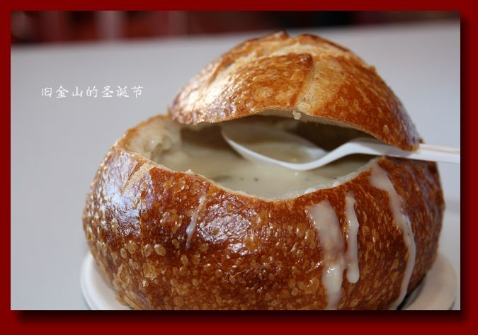 http://i210.photobucket.com/albums/bb92/njfjyy2005/SF2.jpg来到渔人码头,不能错过的美食就是盛在酸面包里的哈蜊浓汤(sourdough bread with clam chowder).记得以前看过铁凝的<大浴女>里面就有对这个美食的描述,书里把这个称为"大碗".酸面包中间挖空后盛上浓汤,外面的皮很有咬劲,吃一口面包,喝一口汤,在冬日里感觉很温暖.