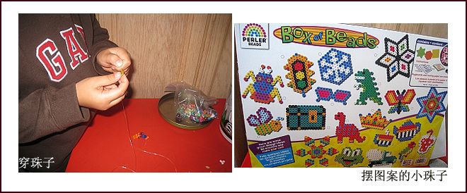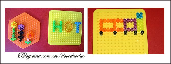 那个可以摆成各种图案的塑料小珠子特别小,对锻炼手指和食指拿捏东西的能力非常有好处,而且孩子可以充分发挥他们的创造想象能力摆出各种造型.多多最喜欢用它们摆成花朵,笑脸;也喜欢摆成单词,还顺带着学点东西,一举两得.不过这两个手工活动不适合三岁以下的孩子,除非家长在旁边紧盯着.