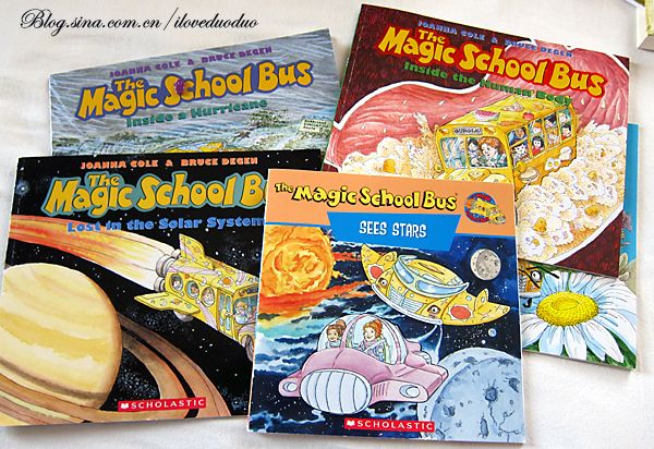 2)自然科学知识的学习:小多三岁上了Preschool后,慢慢地学习了各个方面的自然科学知识,植物动物地理人文星球等等。我发现在学校学习一个主题的时候,在家里引入同样内容的书,会让孩子对读书更有兴趣。比如他们前一阶段学习星系的知识,小多显得格外感兴趣。我就买了几本这方面的绘本,那段时间我们天天读星系的书,小人对这些书爱不释手,小人头脑里也通过快乐的学习方式累积了不少星系的知识。现在小人又开始喜欢上了Magic school bus(神奇校车)系列。
