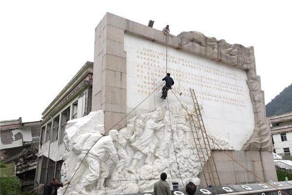 左侧的纪念墙上有工人在悬空作业,清洗墙面。