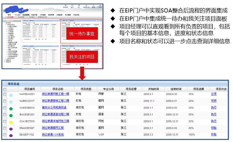 在整合完成后,我们可以将最终的内容作为一个独立的portlet配置到统一门户上面,用户登录门户后即可以看到自己关注的项目的端到端流程和当前状态信息。