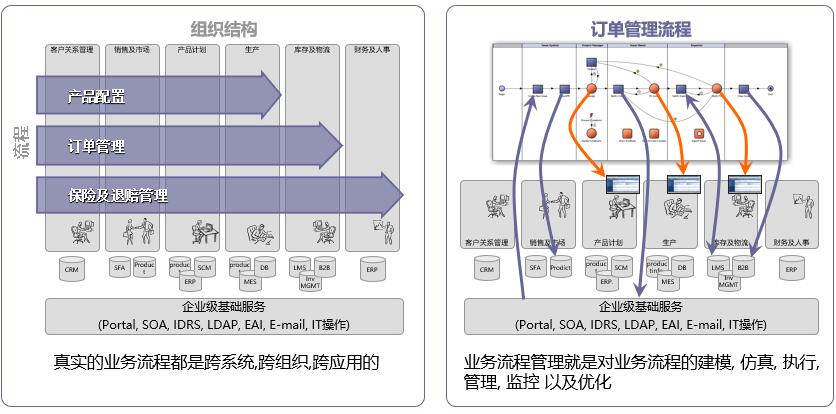 业务流程管理是跨业务组织结构,跨业务系统,跨应用的软件和方法论,从而实现自动化管理,优化动态业务,产生真正的业务价值。更多体现的是跨业务域,端到端业务流程的管理和整合。