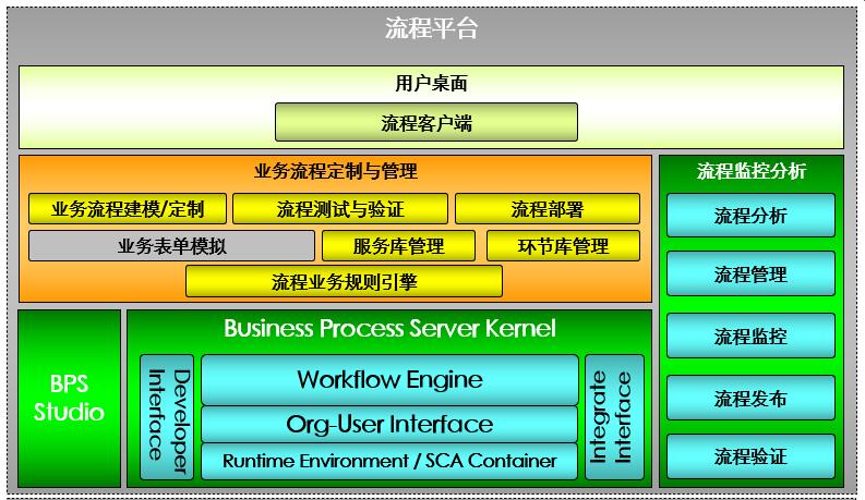 一个完整的BPM系统本身就可以理解为一个既开放,又相当封闭的SOA架构平台。开放主要是说该系统能够很好的集成和复用已有的SOA共享服务能力,封闭则是说BPM软件可以从设计建模,到测试,到部署上线端到端的完成一个业务应用的构建。
