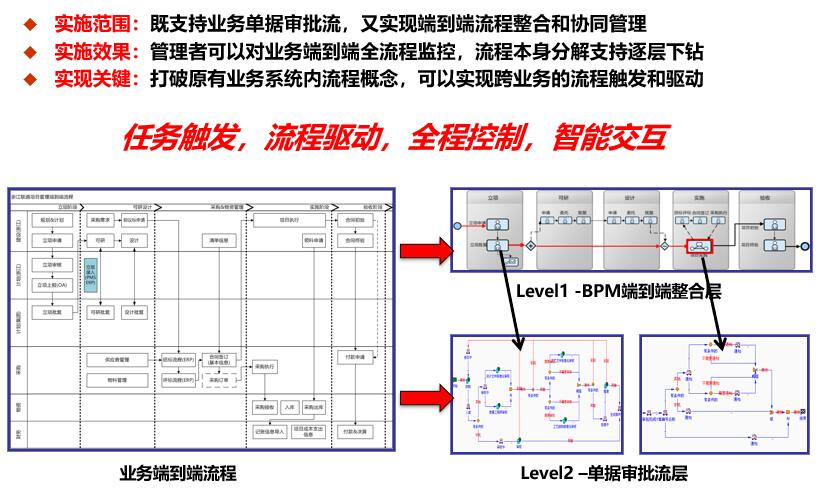 第一个方面是通过BPM来实现端到端流程执行的监控和流程绩效评估,注意这本身在完整的应用架构里面就是在执行层上面的事情,这样可以减少和已有的业务系统之间的功能性冲突。