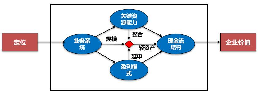 书中提出的商业模式结构图,即图中的红色菱形部分,而这才是商业模式真正的核心。即通过业务系统规模的扩大,对企业各种关键资源和能力的掌控,驱动企业发现衍生和延伸的各种增值服务,由该增值服务形成可持续发展的现金流。
