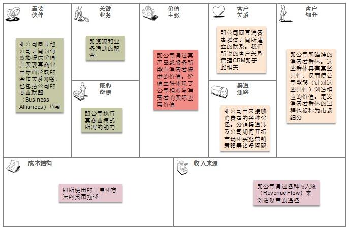 企业的业务是什么?目标客户是谁?需要向他们提供什么样特征的产品或服务?定位的重点是SWOT分析,需要理解市场和细分市场,时刻结合企业优势和核心竞争力分析考虑差异化。定位是商业模式的起点,它的确立涉及到对过去的分析,对现在的把握和对未来的预测。