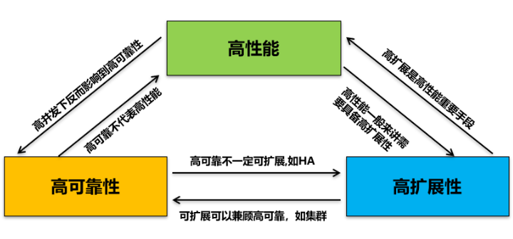 上图可以看到高可靠,高性能和高扩展性三者之间的关系。