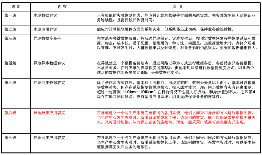 从图中可以看到,如果要实现业务系统本身的异地双活和不间断运行,那么就必须达到第七级的异地同步应用容灾的标准。即是: