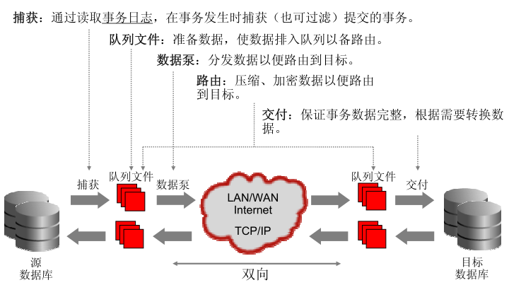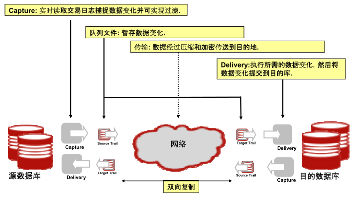 谈到数据库的实时复制,一般会谈到一个重要产品,即Oracle公司的GoldenGate,该软件是一种基于日志的结构化数据复制软件,它通过解析源数据库在线日志或归档日志获得数据的增删改变化,再将这些变化应用到目标数据库,实现源数据库与目标数据库同步、双活。