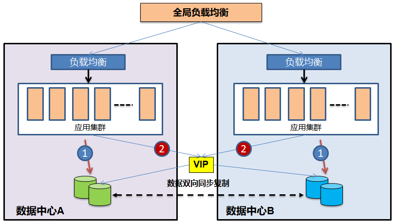 对于方式1即应用集群只固定访问同数据中心的数据库,对于方式2即应用集群全部访问上层两个数据库暴露的VIP地址,通过VIP来确定访问两个数据库。