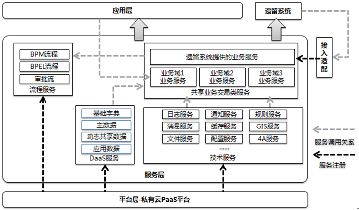 其中PaaS技术平台层提供的4A和流程服务、DaaS数据库服务、技术服务(消息、日志、安全、文件、配置、通知、GIS)等服务能力都统一注入和接入到服务总线。实现纵向的平台层能力向上的能力开放和服务共享。