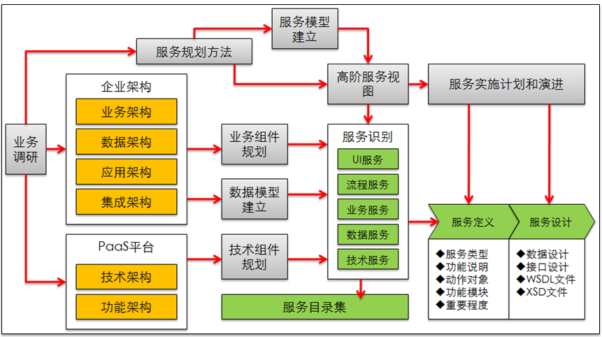 第一步找服务的过程,是系统分析和建模从上向下的过程,要充分体现流程驱动IT的实现,通过流程的分解,业务建模和数据建模,识别业务组件和业务能力,通过跨系统或组件的流程交互识别可重用的服务。最终形成可重用的服务资产库。