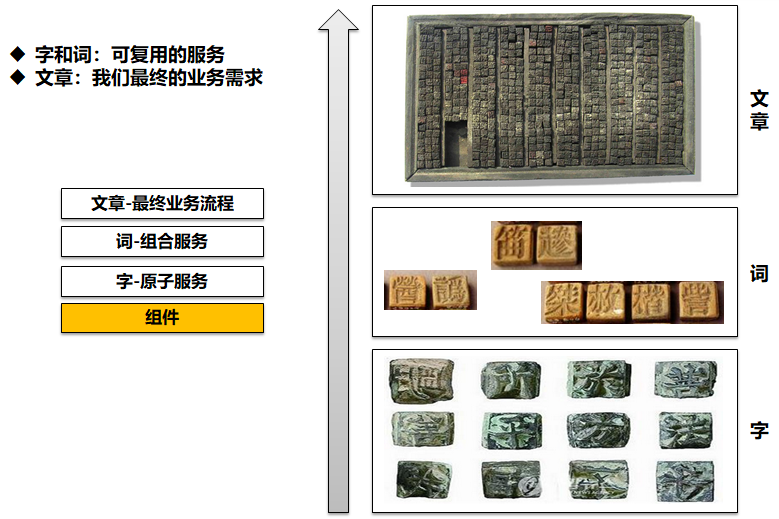 传统的活字印刷术,用于印刷的3000-4000个字即是最基础的原子服务,有了这些原子服务我们很容易通过这些活字去排版整篇文章。文章内容有调整我们也只是需要调整这些原子服务的顺序。但是如果全是单个汉字我们其实排版工作量还是很大,所以再向上我们会出现词组或常用短句,这些即是组合服务,这样我们排版速度可以增加。