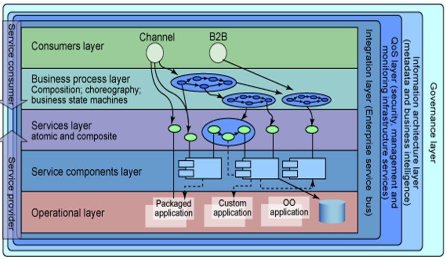 治理层:治理层确保一个组织中的服务和 SOA 解决方案遵守定义策略、指导方针和标准,这些均定义为一个应用于组织中的目标、策略和规章的功能,一个 SOA 解决方案将提供所需的业务价值。SOA 治理活动应该符合 Corporate、IT 和 Enterprise Architecture 治理准则和标准。