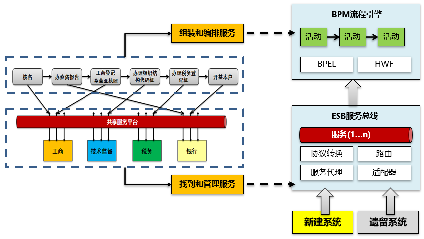 我们以注册一家新公司来举例,可以看到如果我们要注册一家新的公司,我们需要和银行,政府部门中的工商,税务,质量监督等多个业务部门到交道,最终完成新公司注册的完整过程。