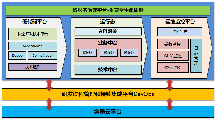 在这个云原生技术平台架构中,整体的底层是容器云平台和DevOps过程支撑平台。在上面基于整个软件生命周期分为了开发态,运行态和运维态。