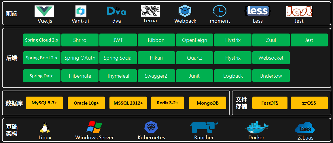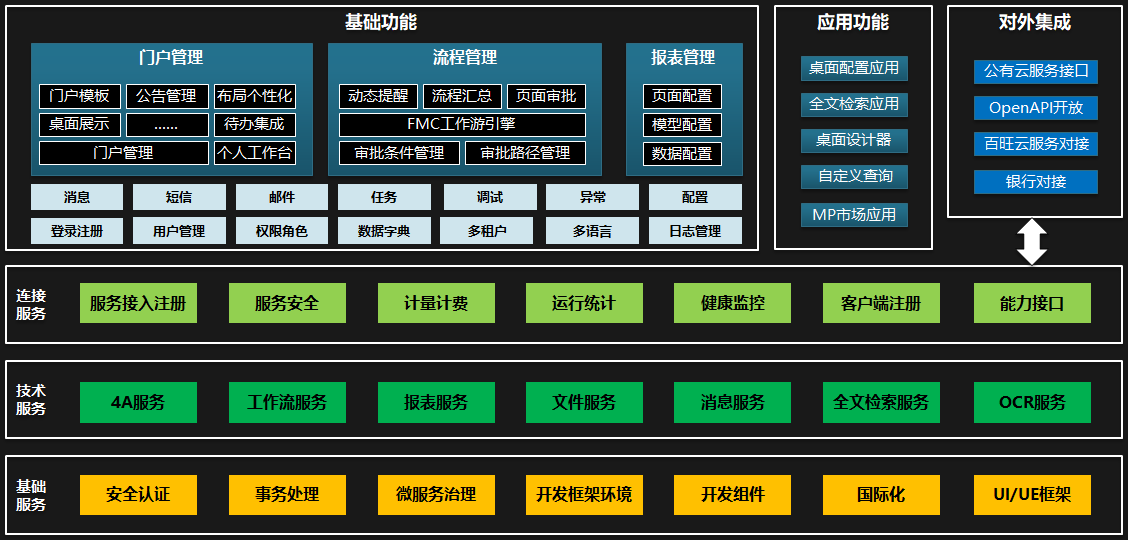 这个技术平台是在SpingCLoud的基础上进行了各自业务组件,技术组件的扩展,同时整合了共性的类似消息,4A,流程引擎等能力,通过该平台可以更好的支撑上层功能应用的开发。