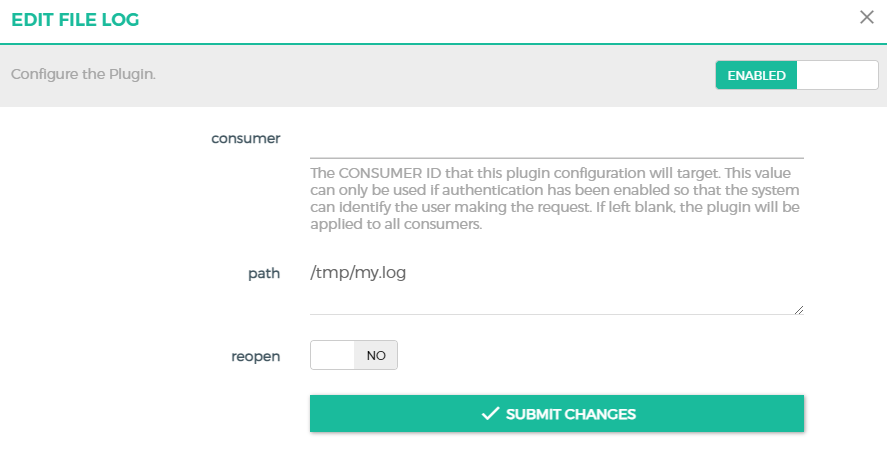 基于前面接入的获取省份信息接口服务,我们可以对该服务进行插件配置,比如添加一个日志记录插件,类型为file-log。新增插件后,具体只需要简单配置日志记录路径即可: