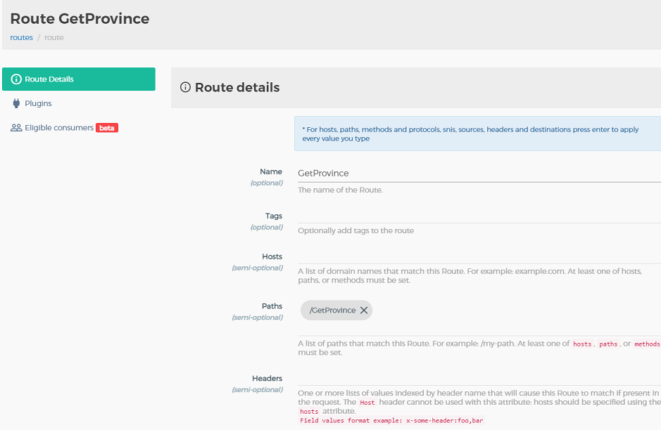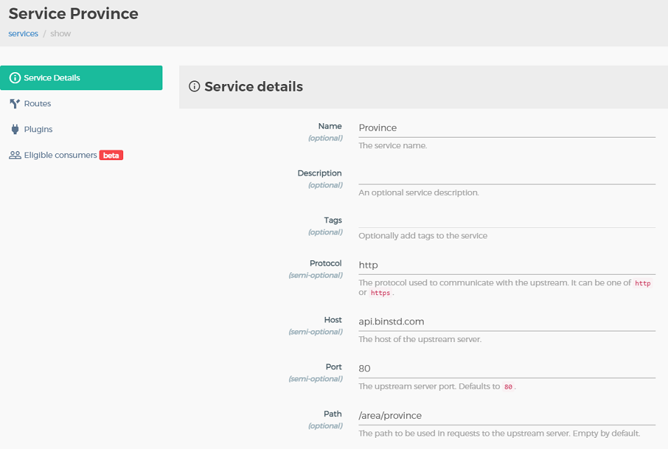 在路由服务后重点做两处配置,一个是Path路径,我们这里填写/GetProvince, 即当消费者访问/GetProvince这个路径地址的时候会自动路由到前面Service服务定义的/area/province这个路径上面去。