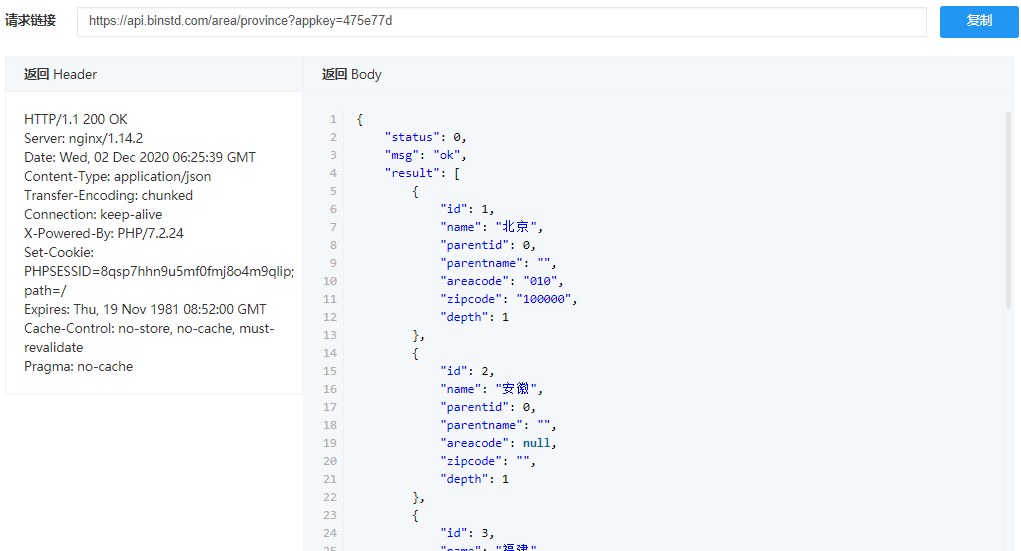 即查询行政区域信息接口服务。在使用接口前需要先注册一个免费账号并获取appkey值,然后即可以免费访问服务。比如获取行政区域接口服务如下: