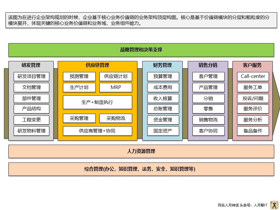 在顶层上一定要注意分域,一般顶层不要超过5个元素,如果超过就必须再次进行分域分类划分,以减轻用户实际上读图时候的认知负担。比如你在做应用架构图的时候,业务系统很多,那么必须先进行分域划分,包括类似财务域,供应链域,人力资源域,生产,研发域等,然后再细化每个域里面的业务系统和功能模块。