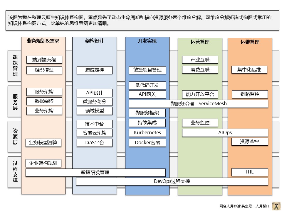 而对于动静结合的构图方式,原来在我博客的构图中也会采用到的,就是一种矩阵式的沟通架构,即x轴体现的是动态生命周期过程,而y轴体现的是分层分域功能。这种构图方式的好处是可以从两个关键维度来看到关键的功能点和KPI指标等,类似这篇文章的配图所示。