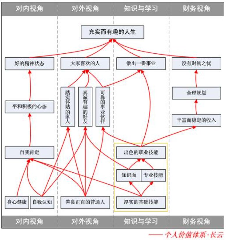 从上图可以看到,整体构图思路基于平衡记分卡在个人管理中的应用,分为了对内,对外,学习成长,财务视角四个维度。而里面最核心的一个点即构图里面的黄色虚框部分,你需要在个人垂直细分的专业领域做到足够的优秀,这个是支撑你价值创值的关键。