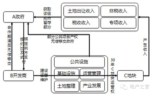 A地方政府与B土地一级开发商就C地块(一般为十几平方公里甚至几十平方公里)的开发达成合作协议,在规定的合作年限内,B开发商负责地块内的土地平整、道路管廊等基础设施建设工作,学校、医院、文化、体育公共设施建设及运营管理工作,产业规划、项目招商、宣传推广等产业发展服务工作,空间规划、建筑设计、物业管理、公共项目维护等基础性服务工作等;于此同时,B开发商以C地块内所新产生收入的该级政府地方留成部分的一定比例(即扣除上缴中央、省、市级部分后的收入)作为投资回报,如新产生的土地出让金、税后、非税收入及专项资金等;合作期限内,A政府只有监督监管的权利,不得随意干扰B开发商的合理经营,政府也不必为开发商的投资进行担保、兜底;合作期限结束后,开发商将C区块的基础设施公共设施产权及经营权无条件已交给政府。
