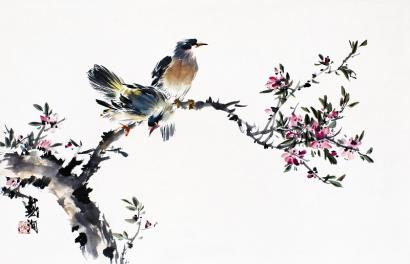纵观戴洵的花鸟作品,常常给人以简约空灵、生动传神之感。他的作品既取元代王冕的简约空灵之气;又学明代唐寅、蓝英花鸟之严谨缜密、清逸洒脱之气,让传统的营养来滋润自己。他的花鸟作品用笔汲取了写意的自如与工笔的细密,虽造型简练质朴,却富有变化,画面清新雅致又生机蓬勃,达到了形神兼备、情景交融的境界。画面经营起于一角,以其“势”显出独具匠心,以其“势”深化观者视觉,以其“势“产生画面的气息,试图产生冲击的力量,扩大画面的表面张力。整个作品以笔墨为骨,墨色为主色调,略赋淡彩,灵动之中不失雅致,活泼之中显现情趣。正因为画面产生出的雅致和情趣,使作品充溢着文人画家那种清逸洒脱之气,谁也不会想到一幅幅简约空灵、清逸洒脱的感人之作会出自于一个年轻画家之手。