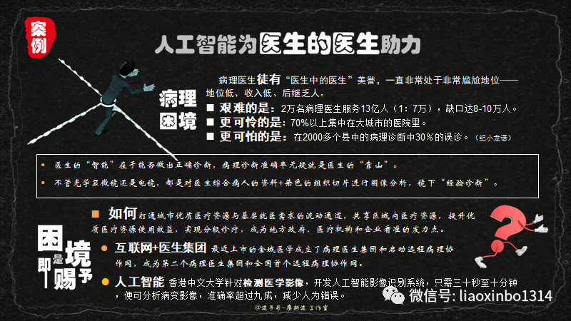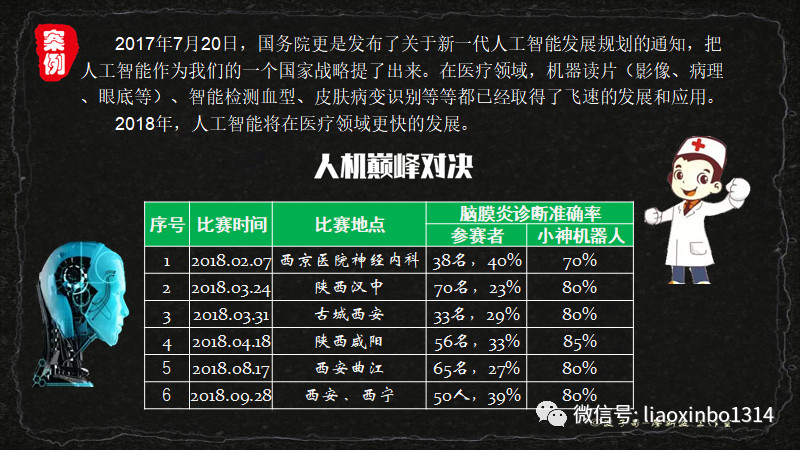 现在很多医生相信智能医疗的准确性,实验证明它总比大多数医生能避免更多的漏诊和误诊。在西京医院曾进行过6次人与机器人AIphaGo的对决,我作为主持嘉宾参加了第5次对决,亲眼目睹在脑膜炎的诊断上,人远远比不上机器人。参赛人员的准确率没有超过41%,而机器人至少有70%的准确率,因为机器人可以快速的连续学习。这个结果令人兴奋,说明技术发展的步伐很快。但是人工智能给出的医疗报告是否真的可以作为诊断的依据呢?你相信吗?很多病人不会相信,这就是个伦理的问题。如何让百姓普遍接受和推广应用人工智能治疗新模式、新手段是目前的一大挑战。我想最应该去推广的人应该是受益的病人和那些已经掌握一些技术的医学专家们。补充一点,如果这些专家们不拥抱智慧医疗,不仅他们没有起到帮助智慧医疗发展的作用,他们也将会失去目前自身的优势。