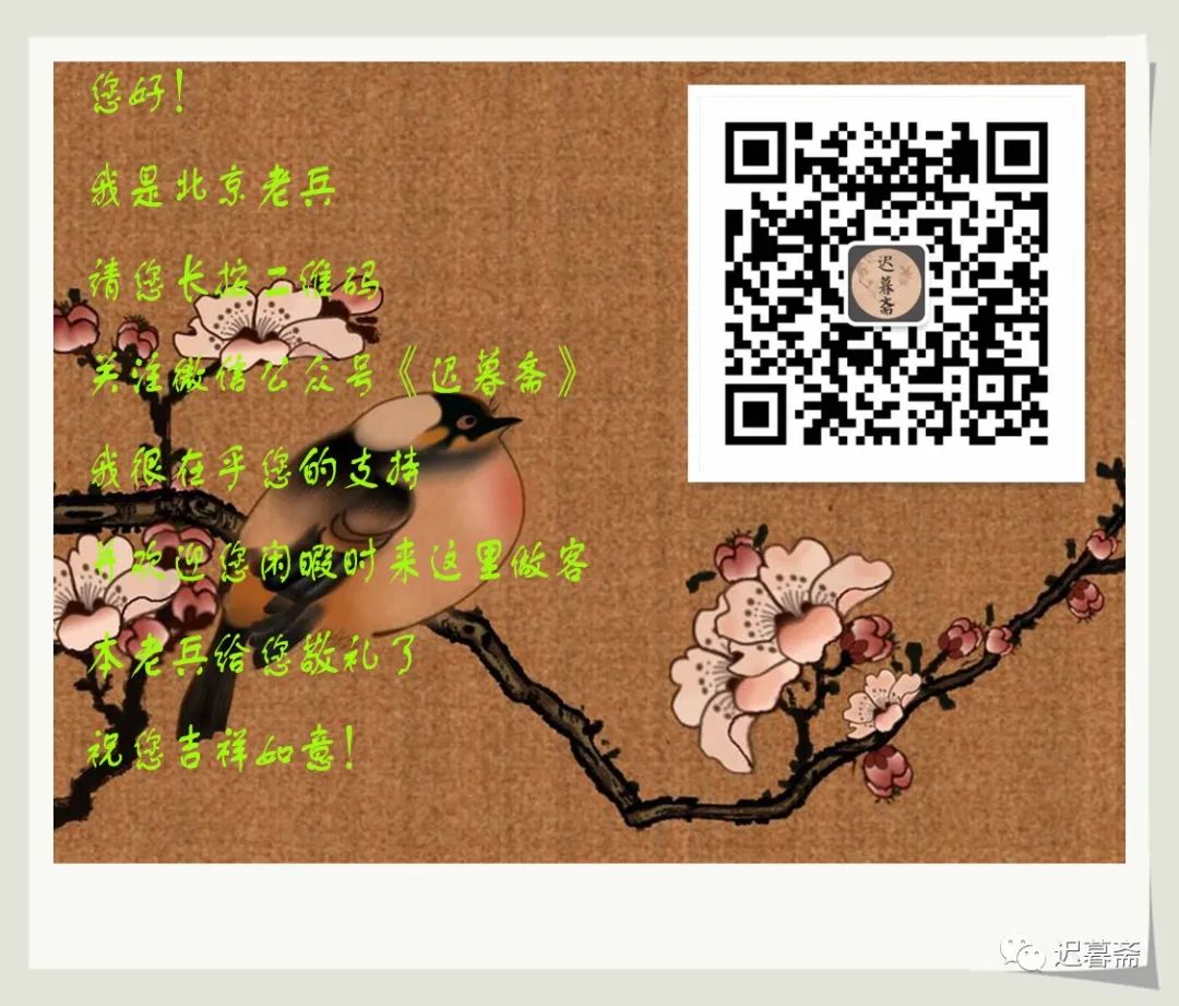作者简介:北京人,1964年出生,祖籍辽宁丹东,网名“北京老兵”。1982年10月入伍,1984年荣立个人三等功一次,1985年进入广州解放军体院学习。1987年考入北京大学分校学习新闻,1990年在央视体育部实习,参加过亚运会的转播工作。2005年起,在新浪博客上闲暇写作、摄影、随笔上百篇。2019年开始,在公众号发表文章,欢迎您关注我的公众号”迟暮斋“,感觉和您的口味,就用手指点亮“在看”支持北京老兵。谢谢!