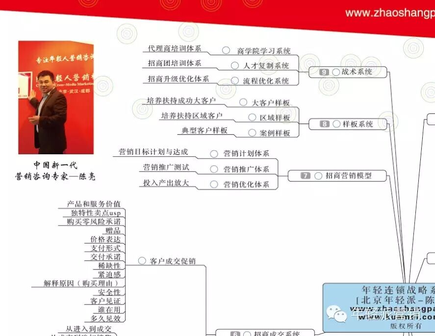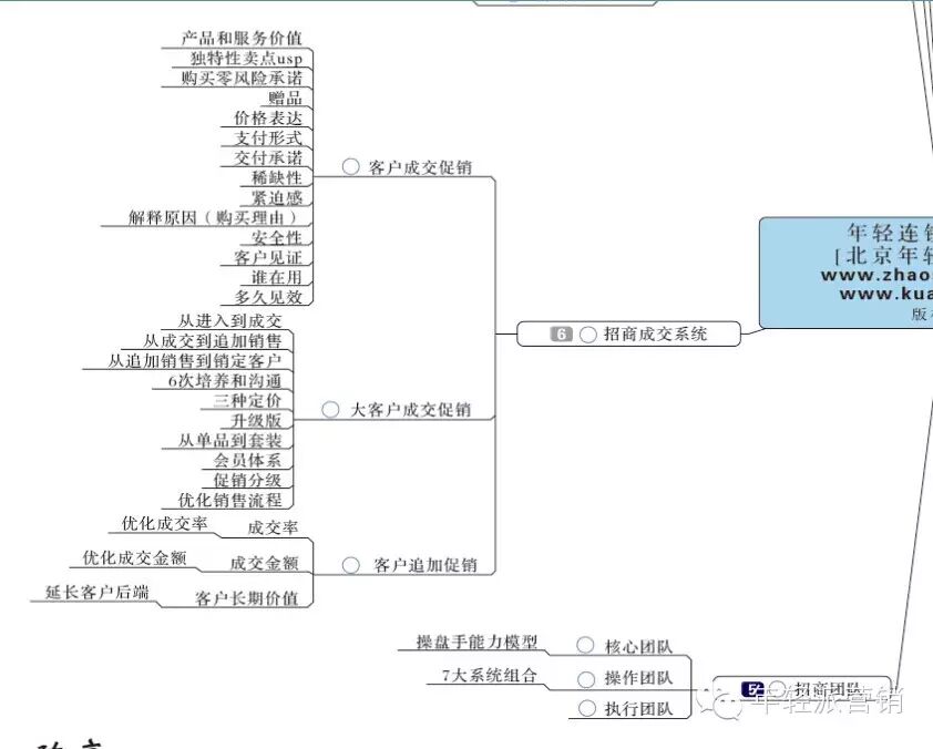 6招商成交系统 客户 成交与促销 在成交中有14个关键点驱动客户买和不买;大客户成交,从客户进入到成交,从成交时到追加销售,从追加销售到锁定客户,从产品单价到3种定价,从单品到套装,从套装到升级版,从升级版到最高级,从产品到代理,从代理到合作,从合作到投资,零成本提高至少30%的纯利润穴位;