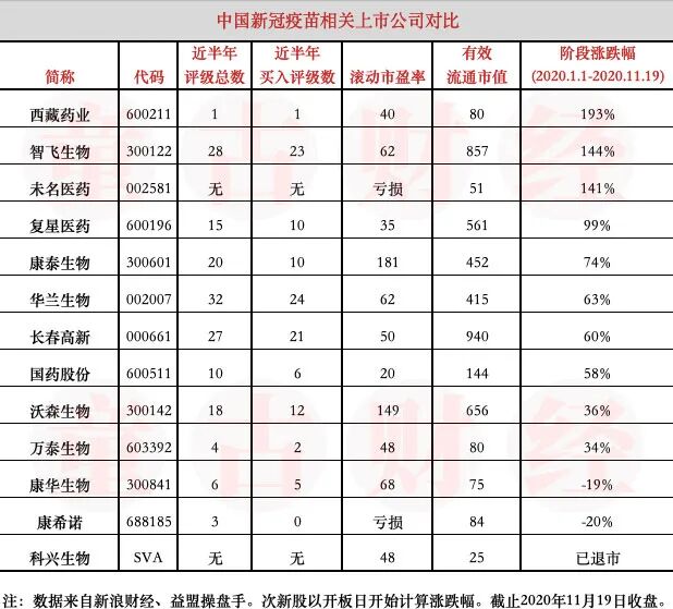 股市表现及券商评级:以下图表揭示了疫苗相关上市公司券商评级覆盖的情况。今年累计涨跌幅、市盈率和有效流通市值也是必须盯的。这将决定具体个股的后续表现。