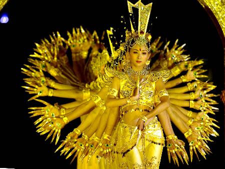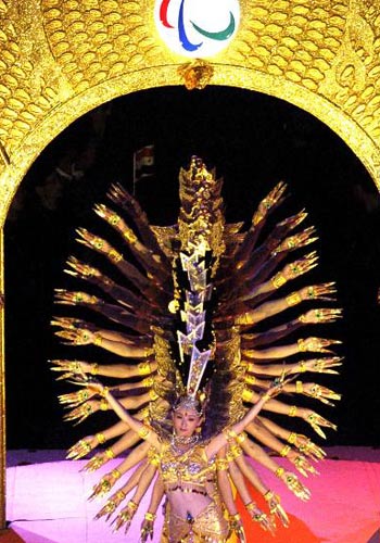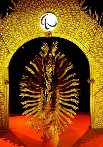 《梦中天堂》在一座莲花台上,聋哑姑娘邰丽华与20位同伴化为一身,在镶嵌着残奥会会徽与一千多只手的金碧辉煌的拱门下,以缤纷的手姿与斑斓的色彩,“述说”着内心世界的美丽话语,描绘着脑海中的梦中天堂。身着白纱衣的4位手语指挥,天使般地相伴四周,向舞者解读着他们无法听到的音乐。