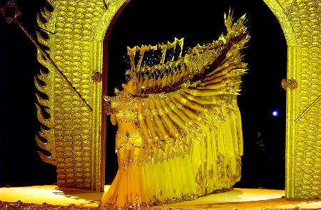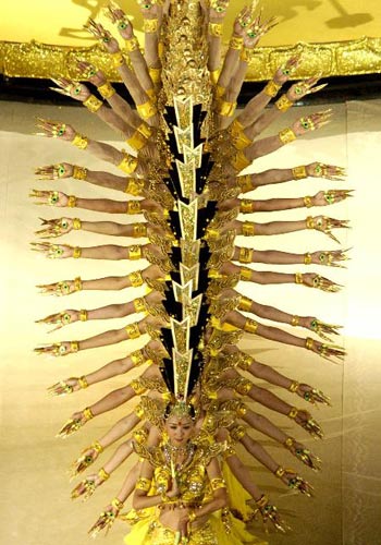 《大地生辉》圣洁的舞者邰丽华以千手恭请无臂青年黄阳光登上莲花台,众多友善之手如花朵绽放,簇拥着黄阳光无臂的躯体;伴随莲花台360度旋转,黄阳光的眼中充满期待和向往,用嘴衔下神圣的2008年北京残奥会会徽。