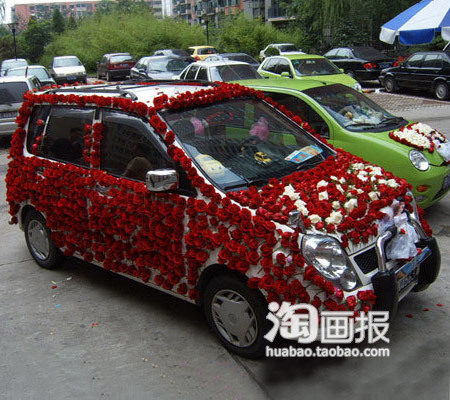大红色的蝴蝶结、黑色灵巧的眼睛、玫瑰花铺成的鼻子,一辆小型越野车经过巧妙的装扮,变成了可爱的“米老鼠”。