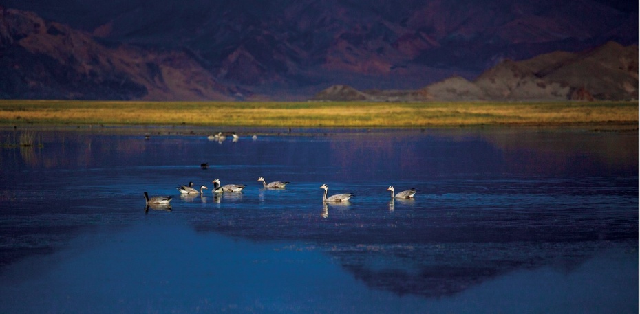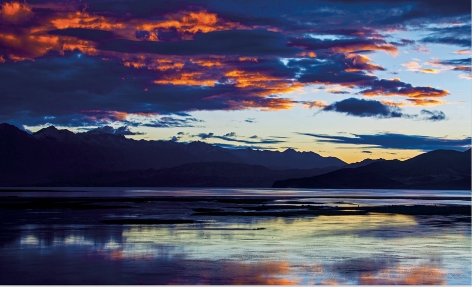 东方的天空彩霞满天,如同锦绣华裳,橙红、金黄、黛青、深紫、幽蓝,班公湖一池斑斓五彩纷呈!温暖的光线转瞬即逝,云层收起了太阳的光芒,亲近水面和沼泽,斑头雁、赤麻鸭在如冰的湖水上慢慢滑行,静静的倒影似乎完全凝固一样,我的耳边偶尔传来了雁鸥几声“啾啾”鸣叫,瞬间将我从梦境中带回现实世界。在看眼前,整个场景已转变成为幽静的蓝色调,仿佛是某种忧伤的布鲁斯。