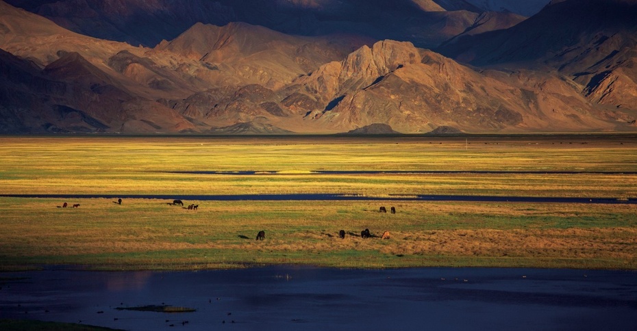 五分钟之内,光线变化迅速,同样的地方在飞速变幻的光线之下呈现出截然不同的迷人景象:光,从山尖移向山腰、草滩……没有光线的照射的远山,呈现出一种悠深的青紫色。当山前的草滩恰恰被光线照亮时,泛着金色的光芒,三五成群闪亮的马儿悠然自得吃草的景象竟让人忘了身处美景之中,恰如梦境!